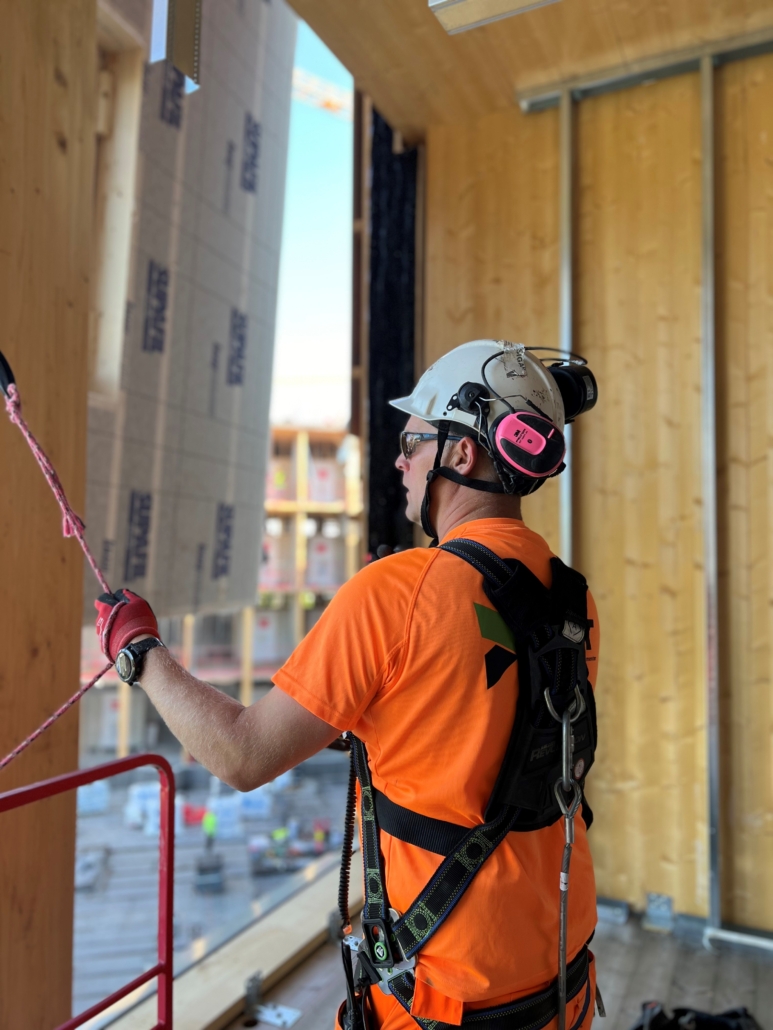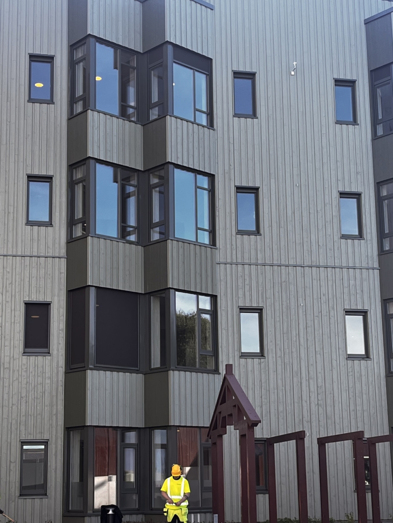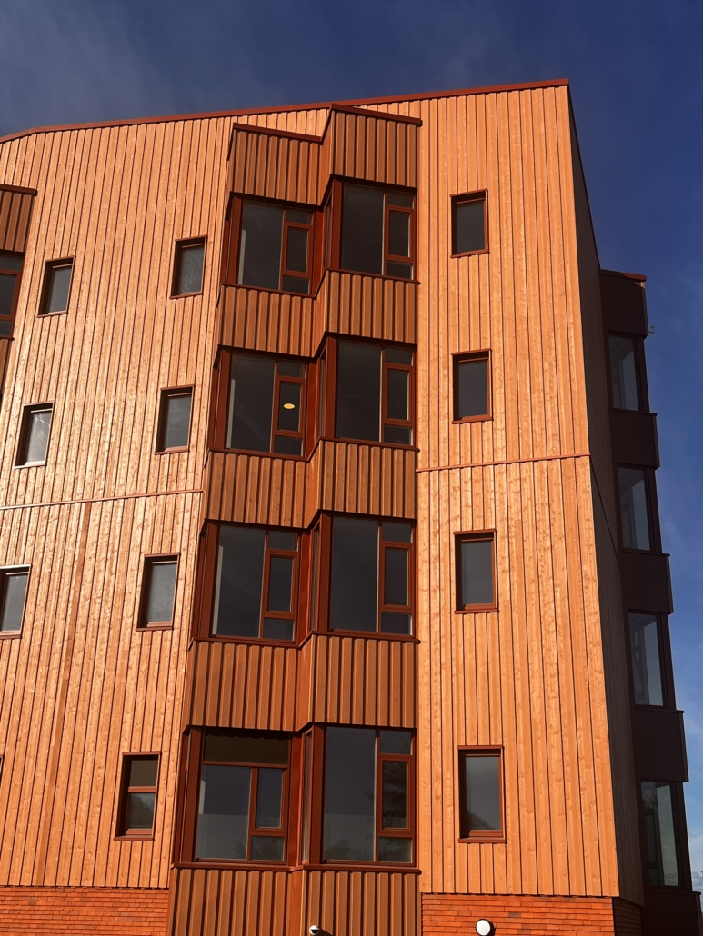 RVT har levert stående veggelementer som er kledd med tømmermannskledning og stedvis påmontert spiler. Et av de mest spennende aspektene ved dette prosjektet er karnappelementene i hjørnene, som går over to etasjer og er levert ferdig fra fabrikk. Disse elementene har skjult søyle, noe som gir rommene et bedre utsyn uten å bli hindret av synlige søyler.
