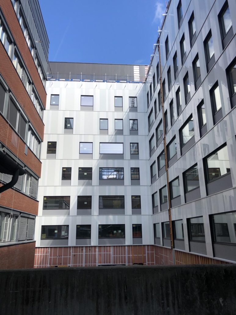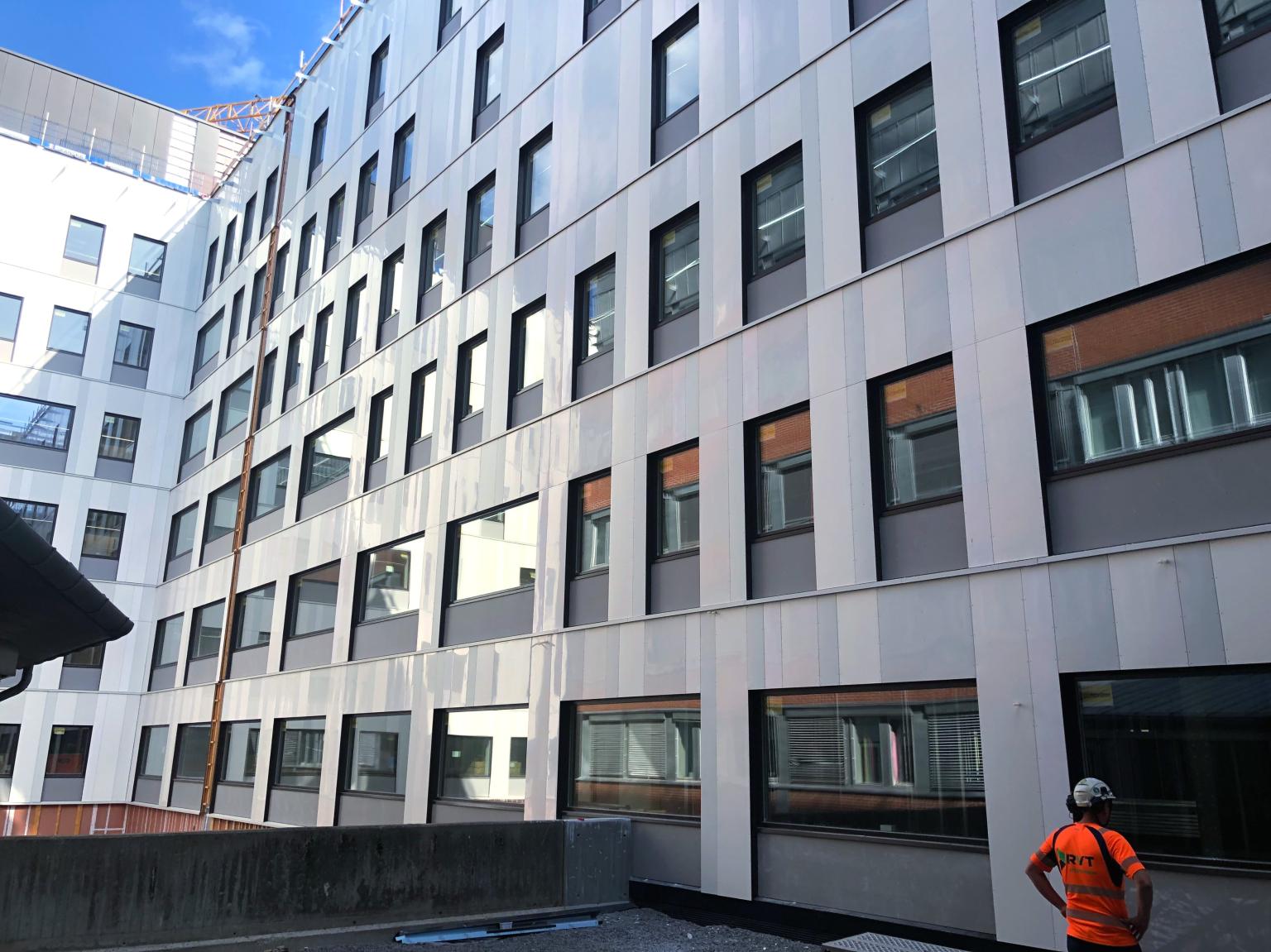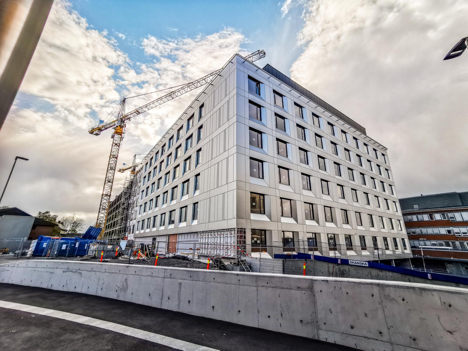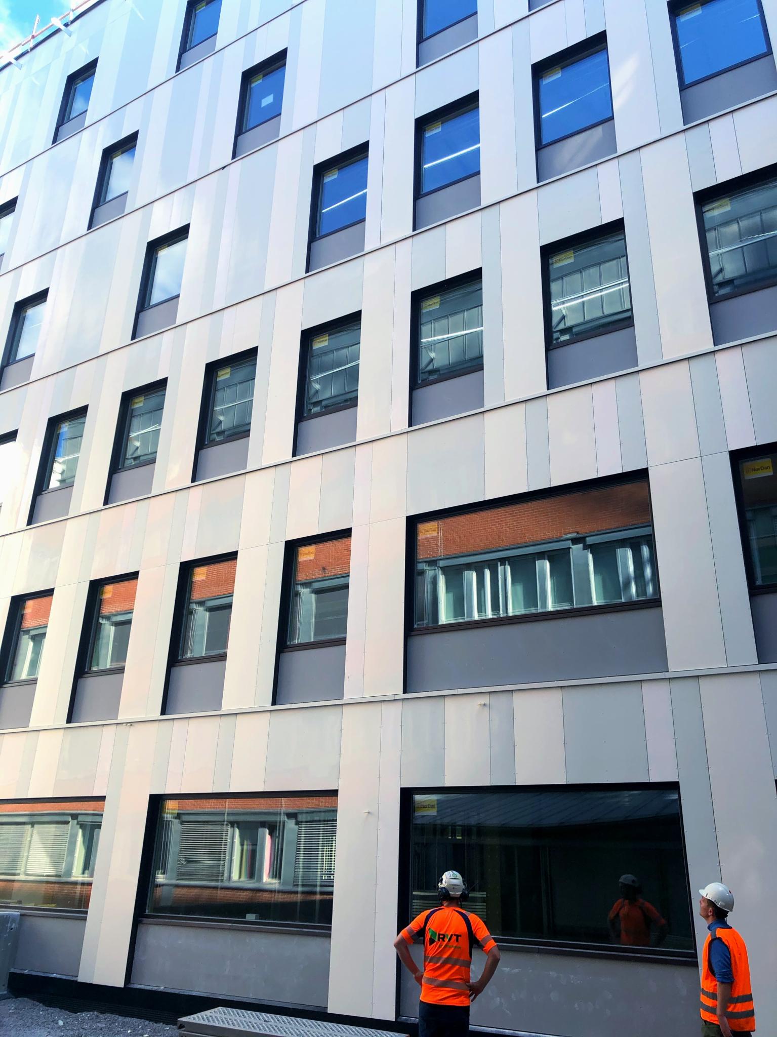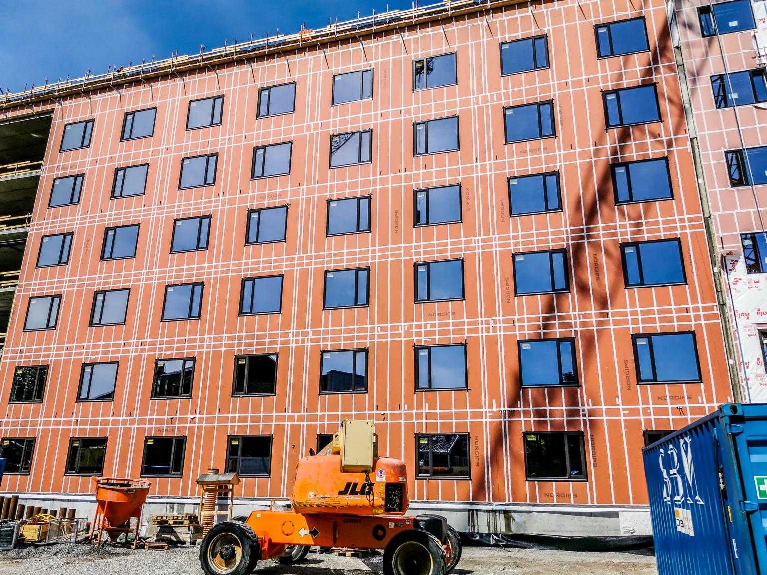 RVT har levert horisontale veggelementer med Steni fasadeplater. Vinduer ble satt på plass i fabrikk. Vi blåseisolerte bygget på byggeplass.