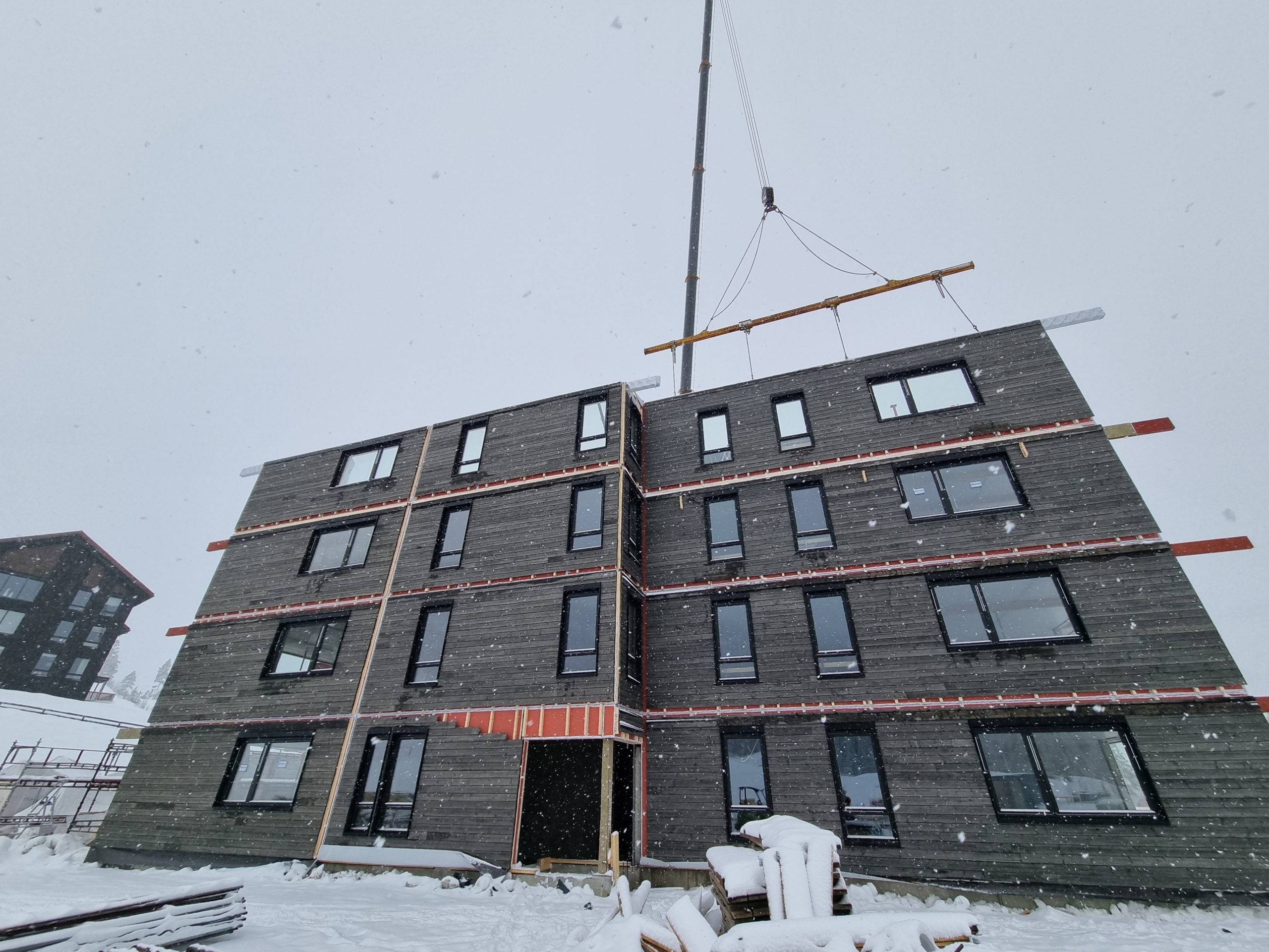 Ytterveggselementer – vi brukte etasjevise veggelementer med 248 mm bindingsverk, gu, sløyfer og liggende d-fals NORD-kledning som er blåseisolert på byggeplass.