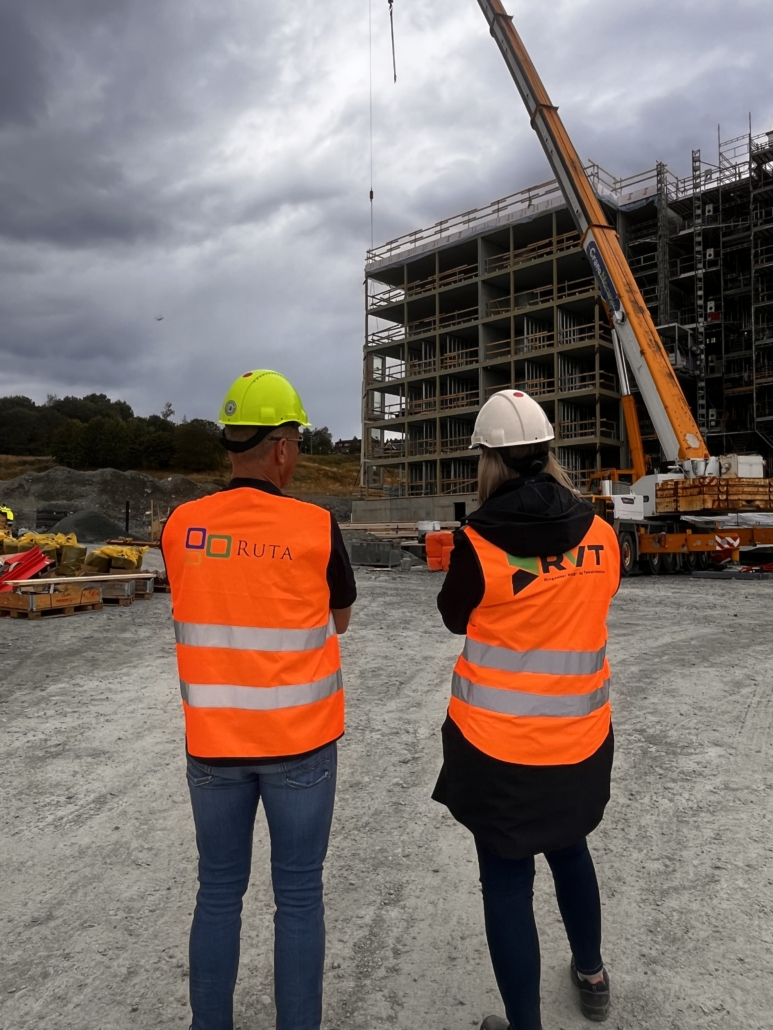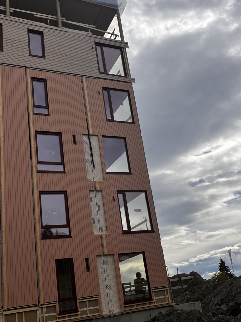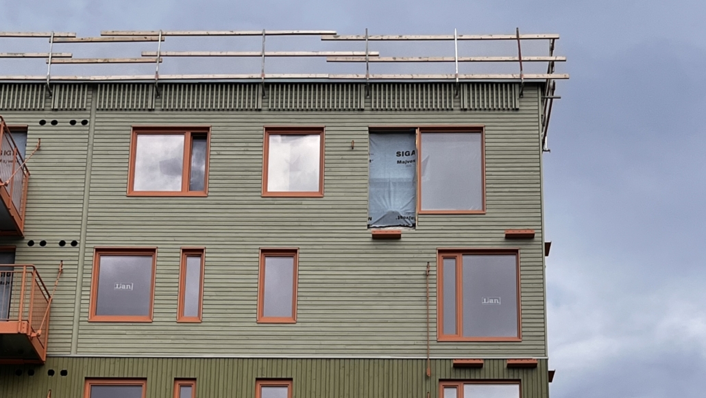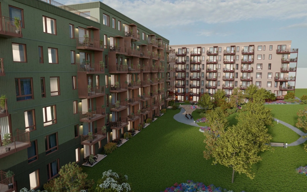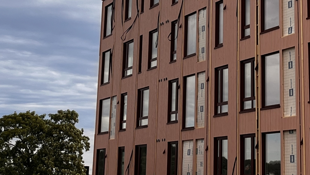 RVT har levert stående og liggende veggelementer. Her har vi tatt i bruk nye løsninger som kledning med skjult innfesting og montasje av balkongsverd i produksjon.